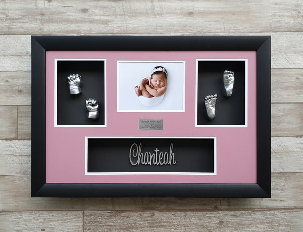 Please note this name frame can fit up to 12 month old casts. An example of how the casts will be displayed is shown. Additional cost for children above 6 months.